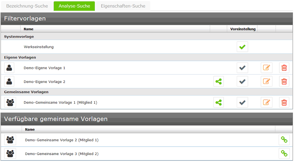 Um die Vorlagen zu verwalten, klicken Sie bitte auf den Vorlagen verwalten-Link in den Filtereinstellungen. Die Vorlagen werden in drei Rubriken aufgelistet: