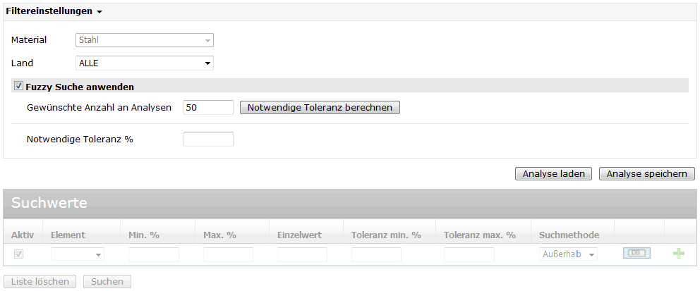 Die Funktion Fuzzy Suche erlaubt die Suche nach einer vorzugebenden Anzahl an Analysen. Dabei werden nicht explizit vorgegebene Toleranzwerte innerhalb Ihrer Vorgaben so angepasst, dass die gewünschte Anzahl an Analysen, wenn möglich, gefunden wird.