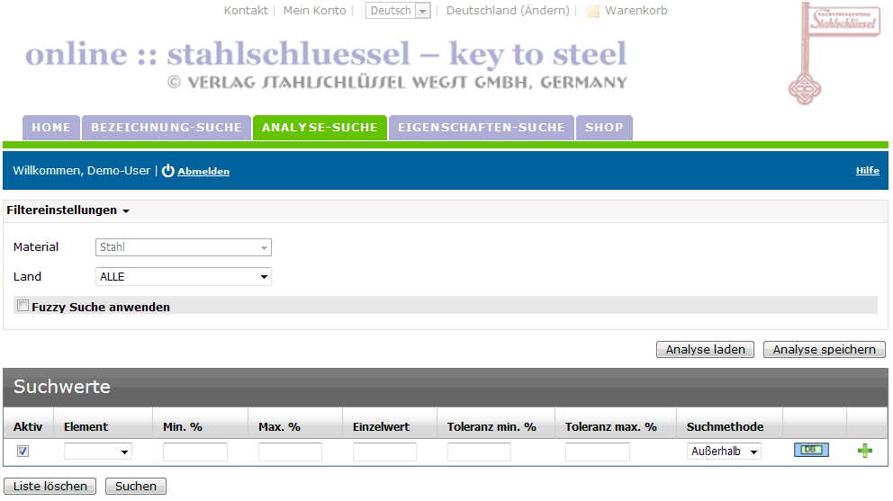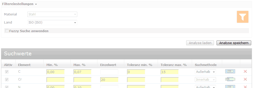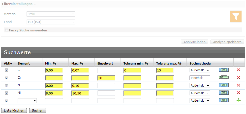 Auf der Registerkarte ANALYSE-SUCHE können Sie durch Eingabe verschiedener Analysewerte nach Werkstoffen suchen. Alle gefundenen Bezeichnungen, deren Analysen den Suchkriterien entsprechen, werden in der Tabelle Ergebnisse dargestellt.