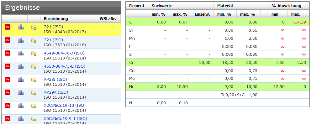 -Symbol werden die Such- und Werkstoffwerte gegenübergestellt und die prozentuale Abweichung ermittelt. Elemente, nach denen gesucht wurde und welche der Werkstoff besitzt, werden grün hervorgehoben. Der selektierte Werkstoff wird in der Ergebnisliste gelb hervorgehoben.