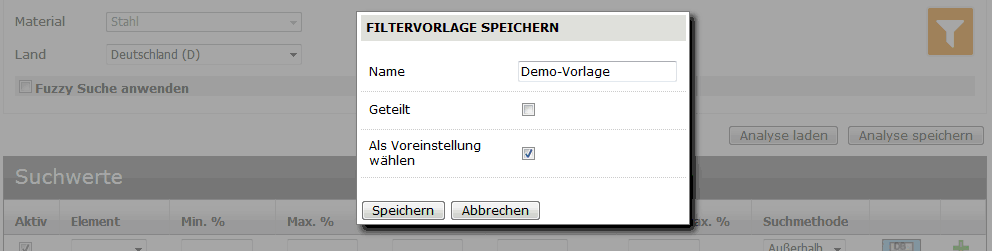 Um eine Vorlage zu speichern, klicken Sie auf den Filtereinstellungen-Link. Es öffnet sich ein Menü. Klicken Sie nun auf Vorlage speichern. Der folgende Dialog wird geöffnet.
