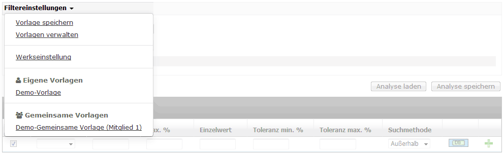 Um eine Vorlage zu laden, klicken Sie bitte auf den Filtereinstellungen-Link. In dem Menü befinden sich zwei Vorlagen-Gruppen:
