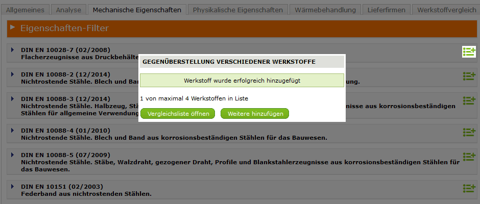 Nachdem der Werkstoff erfolgreich in die Gegenüberstellung aufgenommen wurde, erscheint ein Dialog, über den Sie in die Vergleichsliste wechseln können. Klicken Sie hierzu auf den Vergleichsliste öffnen-Button (falls Sie weitere Werkstoffe hinzufügen wollen, klicken Sie bitte auf den Weitere hinzufügen-Button).
