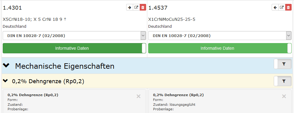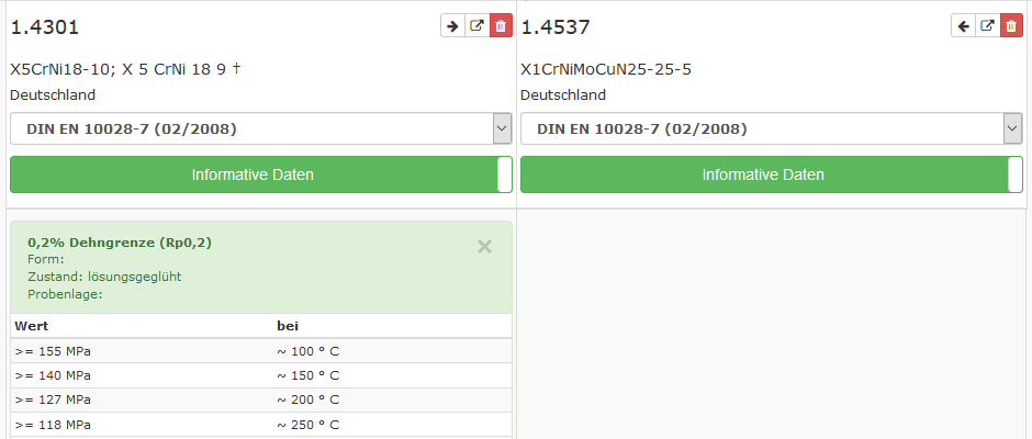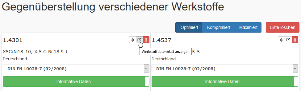 Um einen einzelnen Werkstoff aus der Vergleichsliste zu entfernen, klicken Sie bitte auf den -Button. Sie müssen anschließend das Löschen bestätigen.