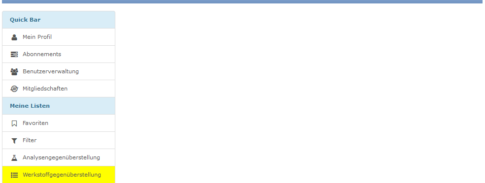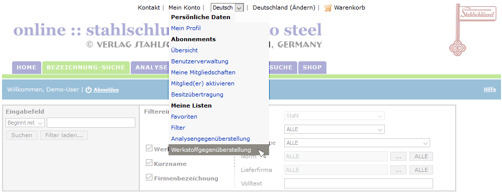 Sie können die Werkstoffgegenüberstellung auch über den Menüpunkt Mein Konto -> Vergleich von Materialien aufrufen.