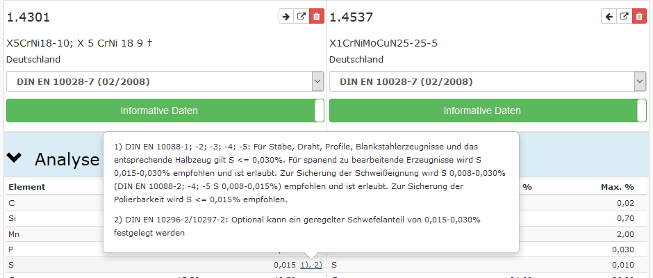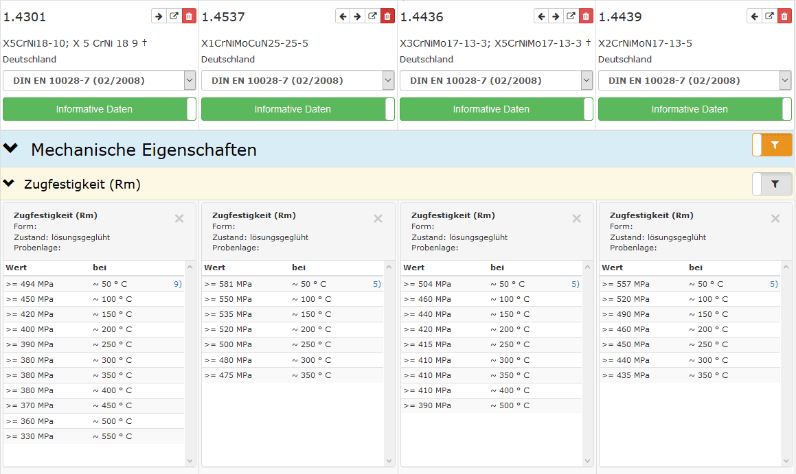 Zu manchen Werkstoffen existieren Eigenschaften, die nicht Bestandteil einer Norm sind. Diese informative Daten können Sie ein- bzw. ausblenden, indem Sie den Informatitve Daten-Button klicken. Falls die Daten eingeblendet sind (standardmäßig), wird der Button dunkelgrün dargestellt. Ausgeblendete Daten werden durch einen hellgrünen Button dargestellt.