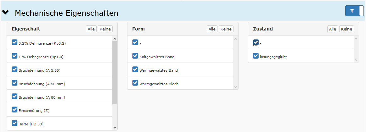 Sie können die mechanischen und physikalischen Eigenschaften auf Eigenschaft, Form und Zustand filtern.