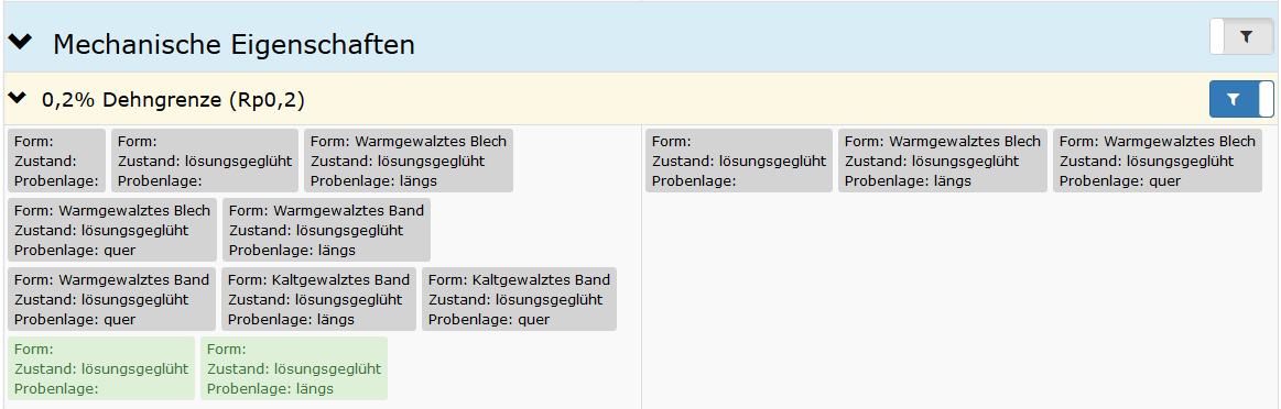 Die Eigenschaftswerte innerhalb einer Eigenschaft werden gruppiert nach Form, Zustand und Probenlage angezeigt.