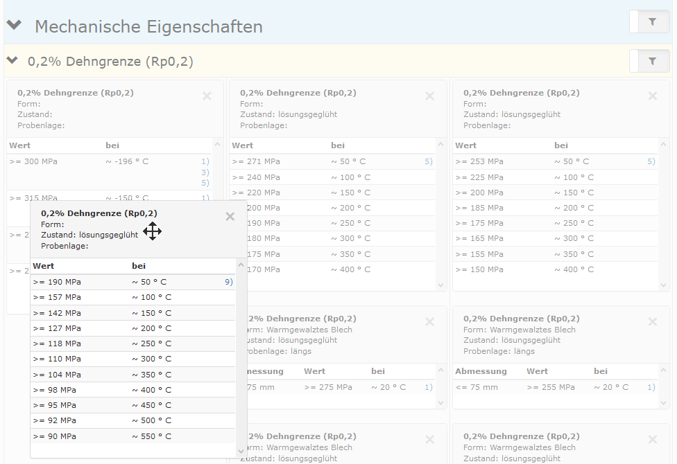 Um Eigenschaftsgruppierungen besser gegenüberstellen zu können, haben Sie die Möglichkeit, einzelne Eigenschaftsgruppen per Drag & Drop (innerhalb eines Werkstoffs und Eigenschaft) zu verschieben.