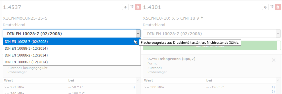 Falls ein Werkstoff zu mehreren Normen Eigenschaften besitzt, kann die Norm des Werkstoffs gewechselt werden. Wählen Sie hierzu einfach eine Norm aus der Auswahlbox aus. Die Daten werden automatisch aktualisiert.